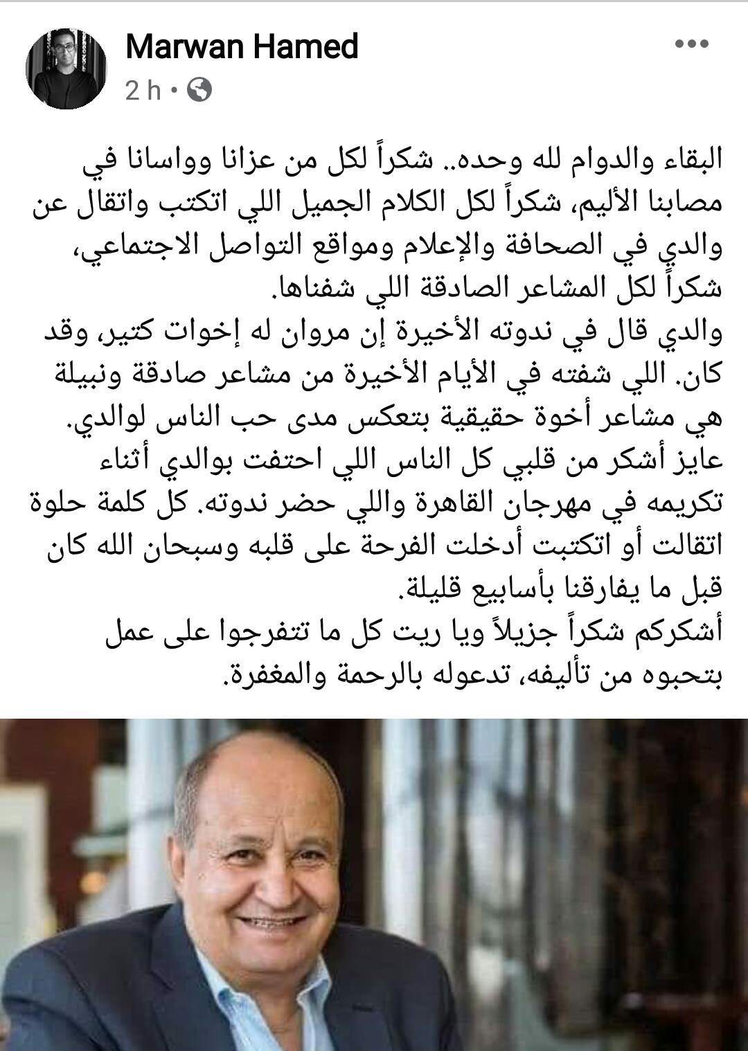 ونشر مروان حامد صورة لوالده الراحل معلقا عليها قائلا: "البقاء والدوام لله وحده.. شكراً لكل من عزانا وواسانا في مصابنا الأليم، شكراً لكل الكلام الجميل اللي اتكتب واتقال عن والدي في الصحافة والإعلام ومواقع التواصل الاجتماعي، شكراً لكل المشاعر الصادقة اللي شفناها".