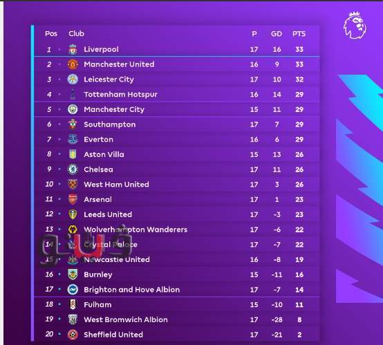 وبالرغم من خسارة ليفربول أمام ساوثهامبتون في مباراة الجولة السابعة عشر الإ أنه مازال يتربع على عرش جدول ترتيب الدوري الإنجليزي برصيد 33 نقطة بالتساوي مع مانشستر يونايتد الذي يمتلك مباراة مؤجلة في البريميرليج قد تجعله منفرداً بجدول الترتيب حال الفوز بها.