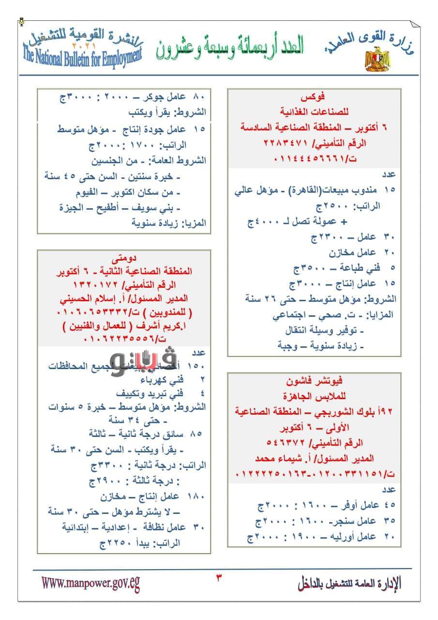و72 عامل أورليه ، و 140 عامل جوكر ، ويشترط أن يقرأ ويكتب براتب من 2000 إلى 3000 جنيه ، و 50 عامل جودة ، و 50 مساعد جودة ، و 67 بائعاً ، و 25 كاشير و 10 كاشيرة ، و 150 أخصائي مبيعات ، و 50 مندوب توصيل طلبات ، و 168 عاملا وعاملة نظافة ، و 99 سائق درجة ثانية وثالثة ، و 45 منسقة تأمين ، و مسئولين مشتريات خارجية ويشترط إجادة اللغة الإنجليزية.