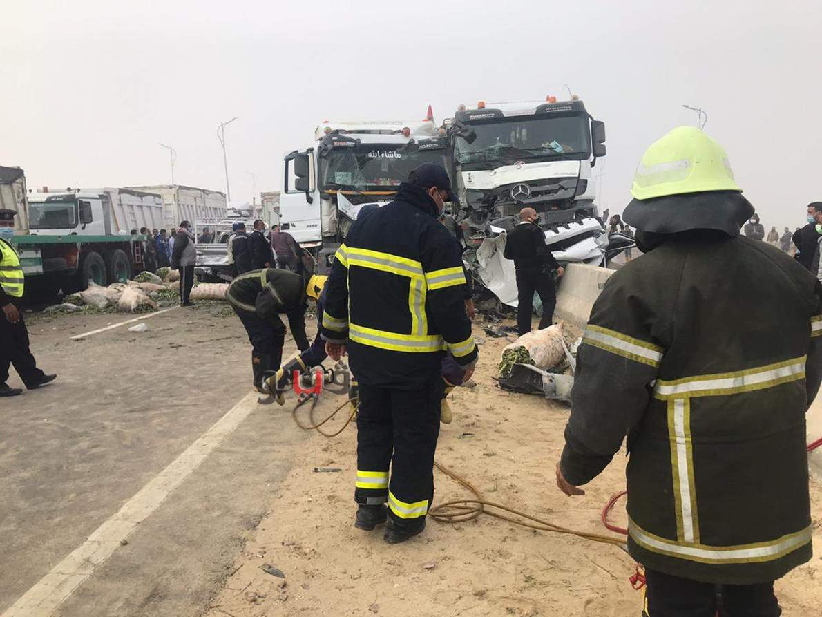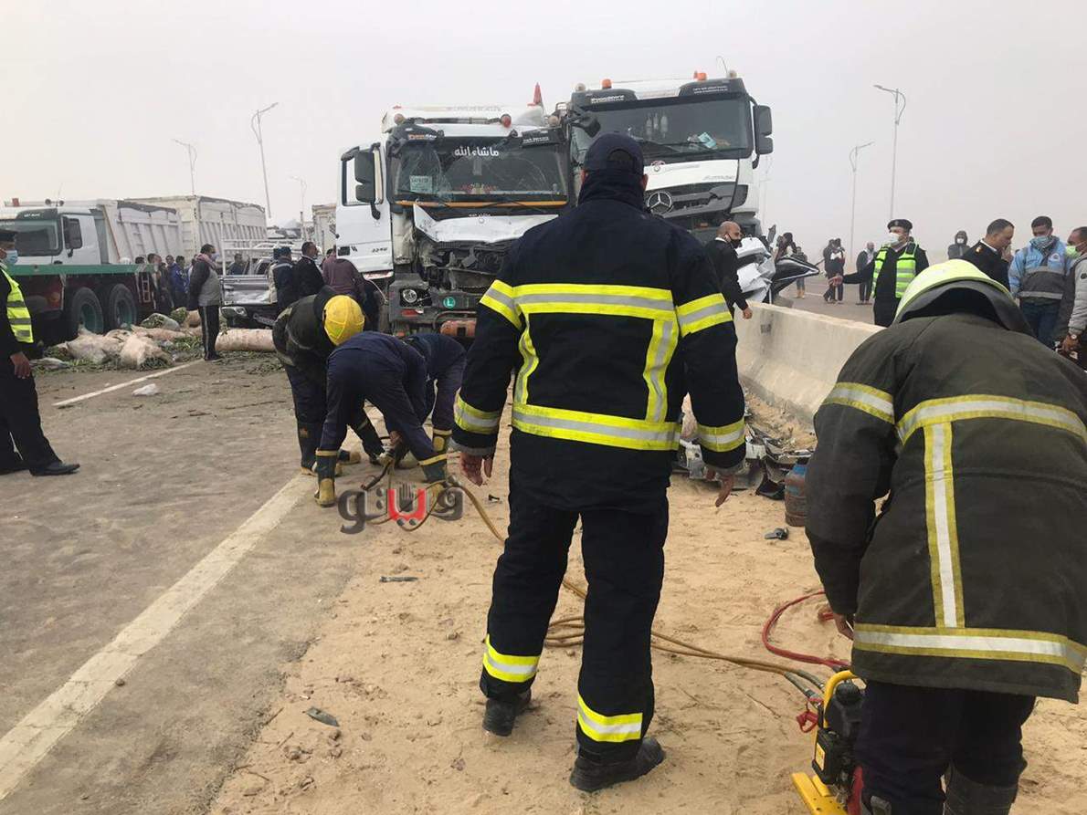لحظة رفع الحماية المدنية لآثار حادث تصادم 6 سيارات بطريق مطروح