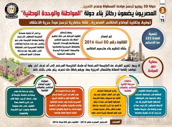 وعن توفيق وتقنين أوضاع الكنائس المصرية، أوضح التقرير أن هناك نقلة حضارية ترسخ مبدأ حرية الاعتقاد، مشيراً إلى أنه تفعيلاً للمادة 235 من الدستور، قد تم إصدار القانون رقم 80 لسنة 2016 بشأن تنظيم وبناء وترميم الكنائس.