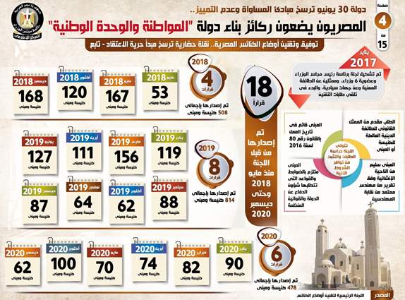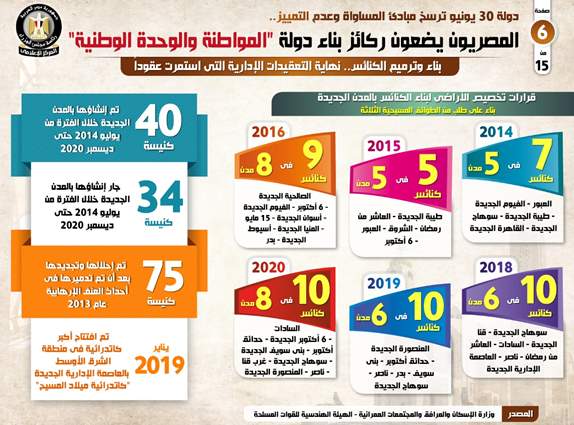 وعلى صعيد متصل، أوضح التقرير أنه تم إنشاء 40 كنيسة وجاري إنشاء 34 كنيسة أخرى بالمدن الجديدة خلال الفترة من يوليو 2014 حتى ديسمبر 2020، فضلاً عن إحلال وتجديد 75 كنيسة تم تدميرها في أحداث العنف الإرهابية عام 2013، هذا وقد تم افتتاح أكبر كاتدرائية في منطقة الشرق الأوسط بالعاصمة الإدارية الجديدة " كاتدرائية ميلاد المسيح"، وذلك في يناير 2019.