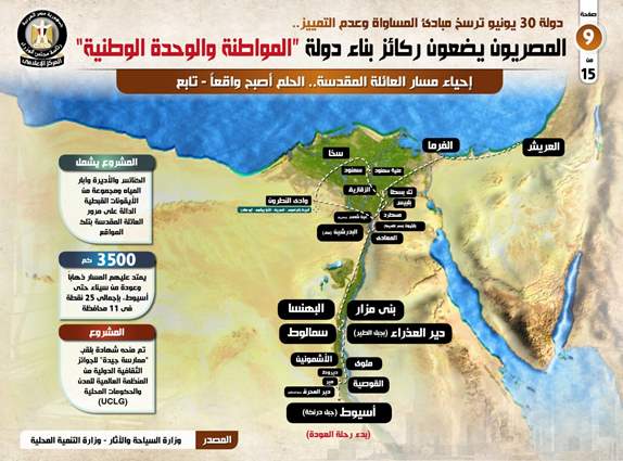 وذكر التقرير أن مشروع مسار العائلة المقدسة يشمل الكنائس والأديرة وآبار المياه ومجموعة من الأيقونات القبطية الدالة على مرور العائلة المقدسة بتلك المواقع، ويمتد على 3500 كم ذهاباً وعودة من سيناء حتى أسيوط، بإجمالي 25 نقطة في 11 محافظة.