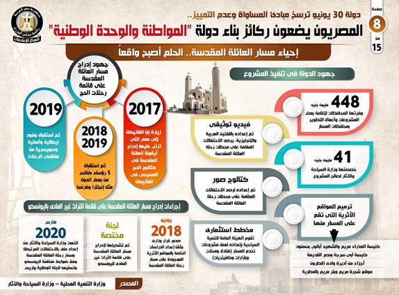 وفي سياق متصل، استعرض التقرير جهود الدولة في تنفيذ مشروع مسار العائلة المقدسة، حيث وفرت المحافظات التي يمر بها المسار 448 مليون جنيه لإقامة بعض المشروعات وأعمال التطوير بها، كما خصصت وزارة السياحة والآثار 41 مليون جنيه لصالح المشروع.