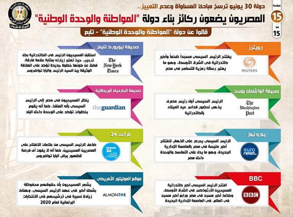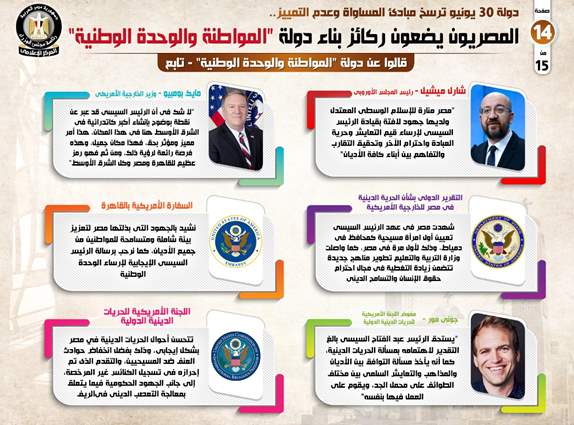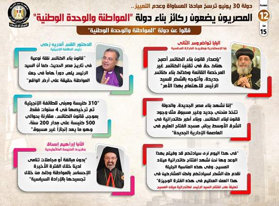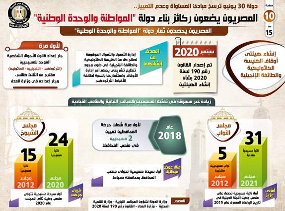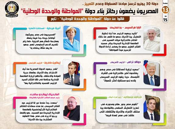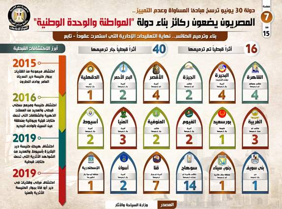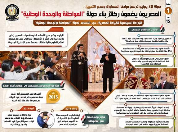 نشر المركز الإعلامي لمجلس الوزراء، تقريراً مفصلاً ومطولاً يسلط الضوء على جهود ومكتسبات وركائز بناء دولة المواطنة والوحدة الوطنية في مصر وترسيخ مبادئ المساواة وعدم التمييز وذلك منذ ثورة الثلاثين من يونيو.