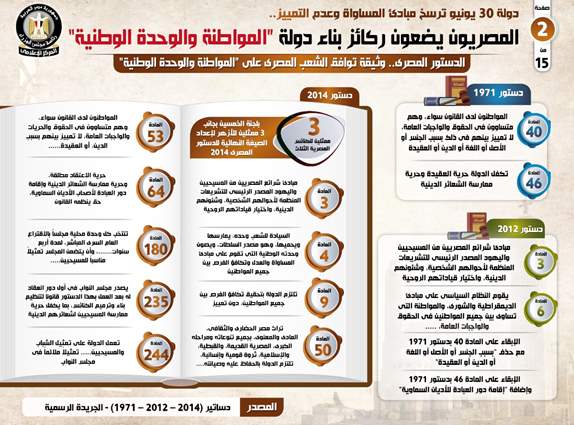 ورصد التقرير التطور الدستوري في الدساتير المصرية لتوافق الشعب على المواطنة والوحدة الوطنية، حيث تنص المادة 40 من دستور 1971 على أن المواطنين لدى القانون سواء، وهم متساوون في الحقوق والواجبات العامة، لا تمييز بينهم في ذلك بسبب الجنس أو الأصل أو اللغة أو الدين أو العقيدة، كما تنص المادة 46 على أن تكفل الدولة حرية العقيدة وحرية ممارسة الشعائر الدينية.