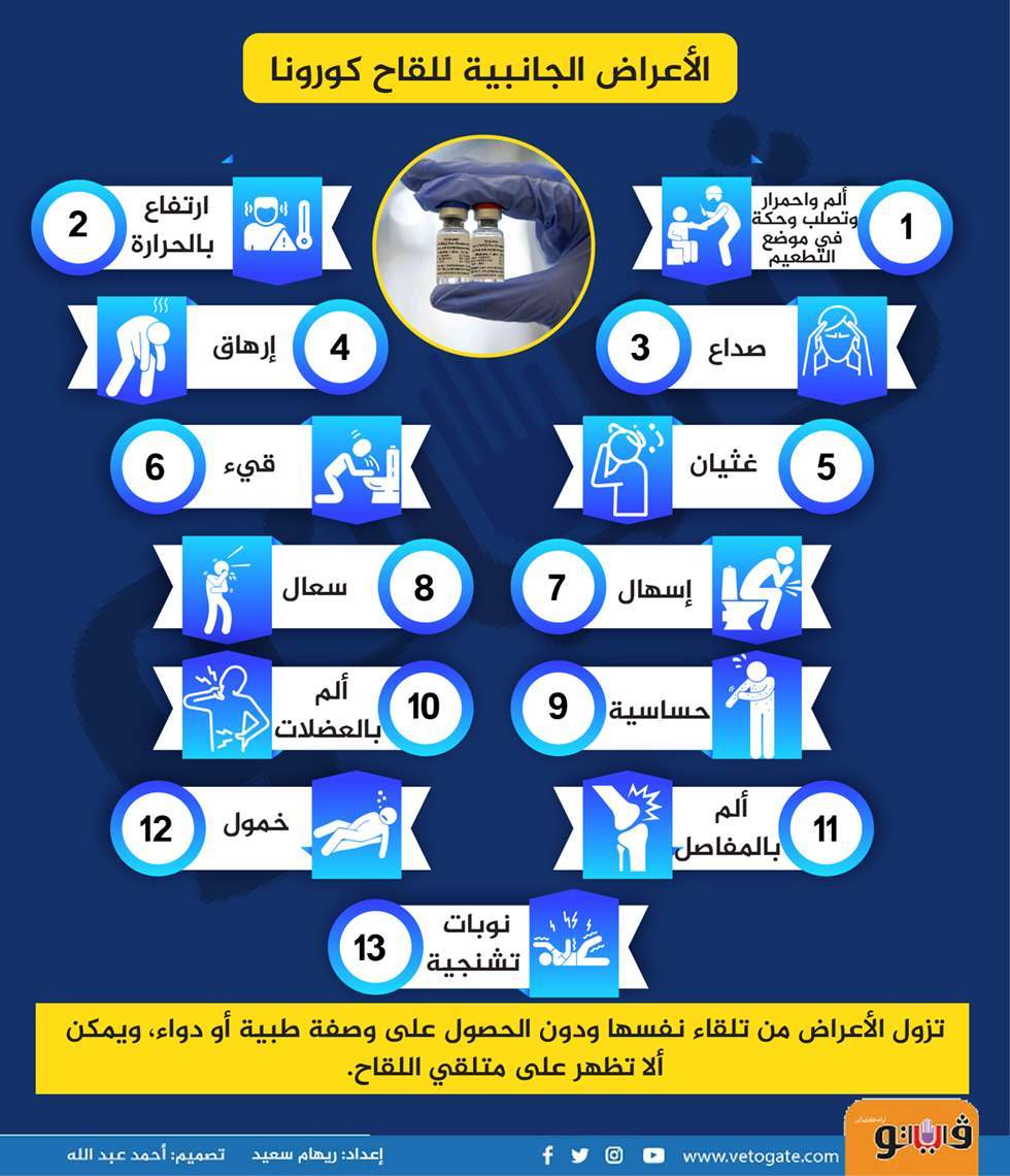 الأعراض الجانبية للقاح كورونا.. إنفوجراف الأربعاء 06/يناير/2021 - 07:21 م 1/6/2021 7:21:33 PM لقاح كورونا ريهام سعيد شارك طباعة 18 حجم الخط شارك طباعة فيروس كورونا لقاح كورونا اعراض لقاح كورونا