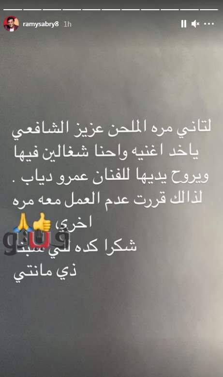 في هذا السياق، نشر صبري، عبر حسابه الشخصي بموقع تبادل الصور والفيديوهات القصيرة «إنستجرام»، بيانا أكد من خلاله عدم التعامل مع الشافعي مرة ثانية، قائلاً: "لتاني مرة الملحن عزيز الشافعي ياخد أغنية وإحنا شغالين فيها، ويروح يديها للفنان عمرو دياب، لذلك قررت عدم التعامل معه مرة أخرى، شكرًا كده للي سابنا زي ما أنتي".