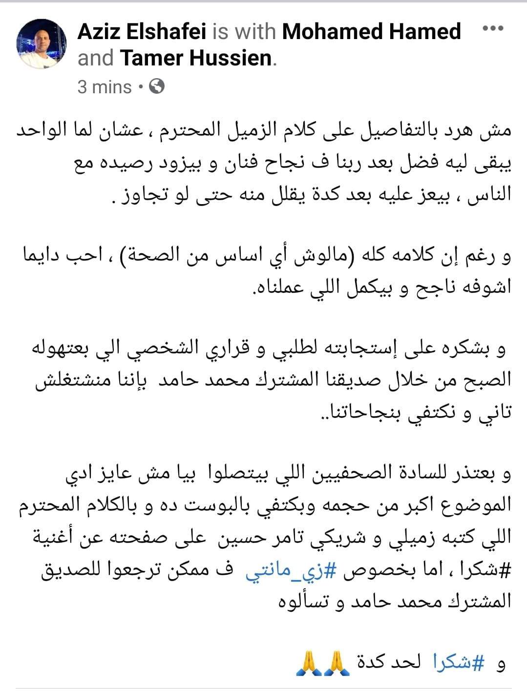 تابع: «وبشكره على استجابته لطلبي وقراري الشخصي اللي بعتو له الصبح من خلال صديقنا المشترك محمد حامد بإننا ما نشتغلش تاني ونكتفي بنجاحاتنا، وبعتذر للسادة الصحفيين اللي بيتصلوا بيا مش عايز أدي الموضوع أكبر من حجمه وبكتفي بالبوست ده وبالكلام المحترم اللي كتبه زميلي وشريكي تامر حسين على صفحته عن أغنية شكرا، أما بخصوص زي ما أنتي فممكن ترجعوا للصديق المشترك محمد حامد وتسألوه».