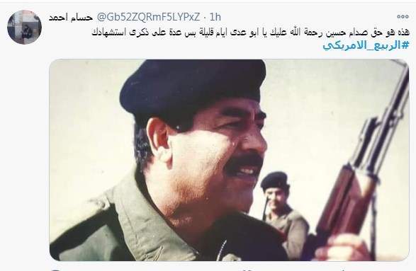 وتابع آخر: "هذه هو حق صدام حسين رحمة الله عليك يا ابو عدى ايام قليلة بس عدت على ذكرى استشهادك #الربيع_الامريكي".