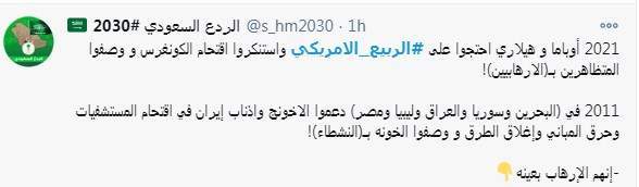 وقال متابع على "تويتر": "2021 أوباما وهيلاري احتجوا على #الربيع_الامريكي واستنكروا اقتحام الكونجرس ووصفوا المتظاهرين بـ(الإرهابيين)! 2011 في (البحرين وسوريا والعراق وليبيا ومصر) دعموا الإخوان واذناب إيران في اقتحام المستشفيات وحرق المباني وإغلاق الطرق ووصفوا الخونه بـ(النشطاء)! -إنهم الإرهاب بعينه".