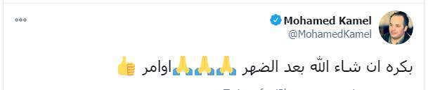 ونشر كامل تغريدة له على موقع التدوينات القصيرة، "تويتر": "بكرة إن شاء الله بعد الضهر.. أوامر".