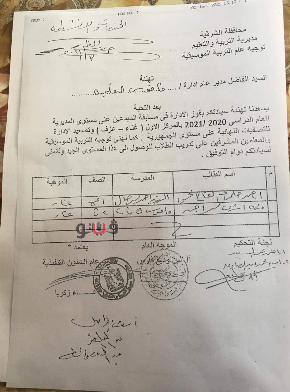 وأضاف أن الإدارة سبق وحققت المركز الأول على مستوى الجمهورية في الإبداع الموسيقي واليوم فاز الطلبة أحمد حلمي عبد الفتاح بمدرسة أحمد بلال الإعدادية بنين والطالبة منة أشرف محمد بمدرسة فاقوس ث بنات بالمركز الأول على مستوى الشرقية في مسابقة الغناء والعزف والمسماة مسابقة المبدعين في التربية الموسيقية لعام 2021 وتم تصعيدهم للتصفيات النهائية على مستوى الجمهورية.