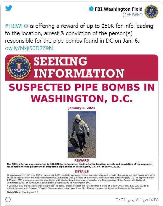 نشر مكتب التحقيقات الفيدرالي"FBI" صورة لشخص مسؤول عن زرع قنبلة في واشنطن، خلال عملية اقتحام مبنى الكونجرس من قبل مؤيدين للرئيس الأمريكي، دونالد ترامب.
