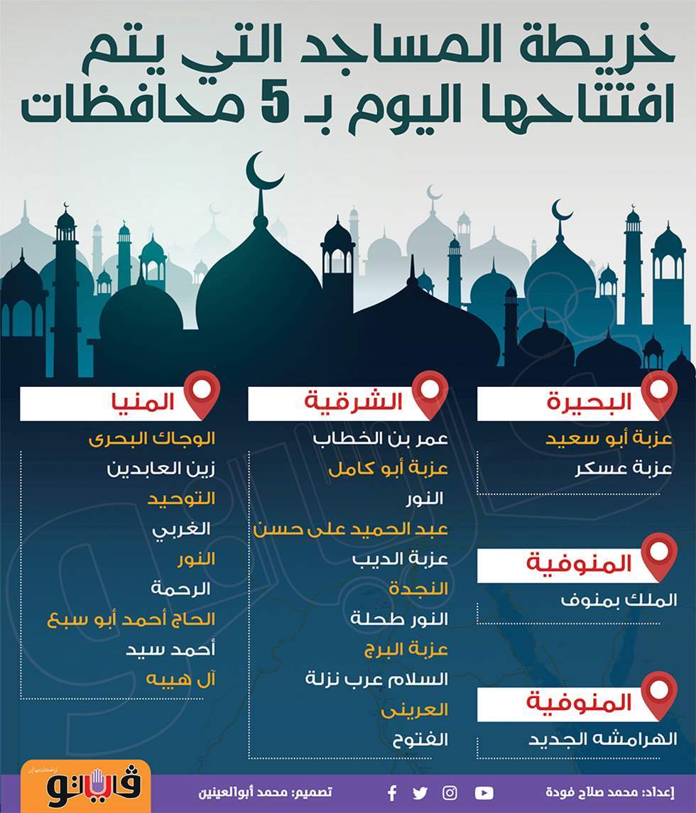 خريطة المساجد التي يتم افتتاحها اليوم بـ 5 محافظات | إنفوجراف الجمعة 08/يناير/2021 - 11:37 ص 1/8/2021 11:37:47 AM خريطة المساجد التي يتم افتتاحها اليوم محمد صلاح فودة شارك طباعة 18 حجم الخط شارك طباعة مختار جمعة محمد مختار جمعة وزارة الأوقاف مساجد الأوقاف