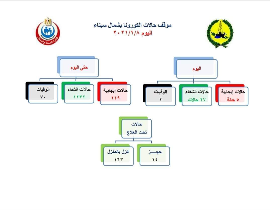 أعلنت مديرية الصحة بشمال سيناء عن وفاة ٢ من الحالات المصابين بفيروس كورونا ليصبح إجمالي العدد من تفشي الوباء لـ٧٠ حالة.
