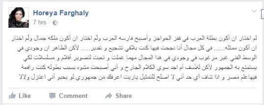 السوشيال ميديا لم ترحم الفنانة حتى في عزلتها وابتعادها عن الأضواء، فقد تعرضت لكثير من الانتقادات، مما اضطرها لكتابة منشور عبر صفحتها على موقع التواصل الإجتماعي "فيس بوك"، قائلة: "لم أختار أن أكون بطلة العرب في قفز الحواجز وأصبح فارسة العرب ولَم اختر أن أكون ملكة جمال ولَم أختر أن أكون ممثلة في كل مجال أنا نجحت فيها كنت بلاقي تشجيع وتقدير، لكن الظاهر إن وجودي في الوسط الفني غير مرغوب فيه، وجودي في هذا المجال مهما عملت وتعبت لتصوير أفلام ومسلسلات لكي يستمتع به الجمهور لكن للأسف لم أجد سوى الكلام الجارح وأني أصبحت مشوهة بسبب بطولة كنت رافعة فيها علم مصر.. إذا شاف اأي حد إني لا أصلح للتمثيل ياريت اعرف من جمهوري لو يحبو اني اعتزل ولا لا".
