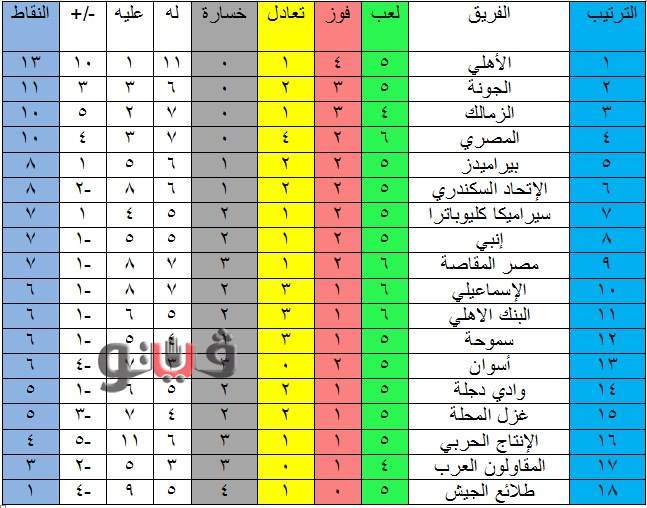 تنشر "فيتو" جدول مباريات مسابقة الدوري المصري الممتاز، بعد انتهاء مباريات اليوم الجمعة، الذي شهد ثلاث مباريات ضمن مواجهات الجولة السادسة جاءت نتائجها على النحو التالي: