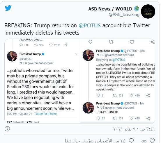 وسريعا، حذفت شركة تويتر التغريدتين الجديدتين للرئيس الأمريكي، ولم تصدر -حتى الآن- أي بيان عن عملية الحذف.