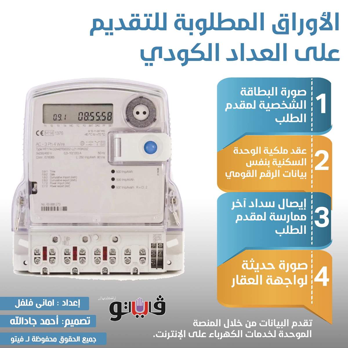 الأوراق المطلوبة للتقديم على العداد الكودي | إنفوجراف الثلاثاء 12/يناير/2021 - 12:43 م 1/12/2021 12:43:24 PM العداد الكودى امانى فلفل شارك طباعة 18 حجم الخط شارك طباعة وزارة الكهرباء العداد الكودي الأوراق المطلوبة للتقديم على العداد الكودى الغاء الممارسة