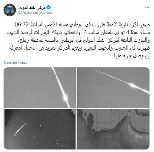 وكتب مركز الفلك الدولي تغريدة على تويتر "صور لكرة نارية لامعة ظهرت في أبوظبي مساء الأمس الساعة 06:32 مساء لمدة 4 ثواني بلمعان سالب 4، والتقطتها شبكة الإمارات لرصد الشهب والنيازك التابعة لمركز الفلك الدولي في أبوظبي.. بالنسبة لمحطة رماح، ظهرت في الجنوب واتجهت لليمين ويقوم المركز بمزيد من التحليل لمعرفة إن وصل جزء منها"
