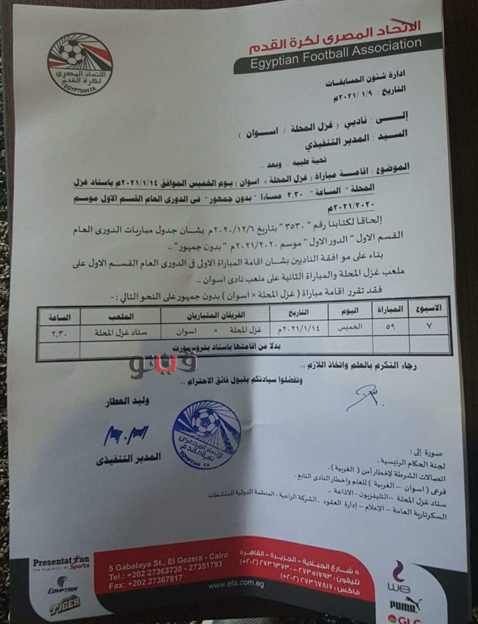 نقل مباراة أسوان والمحلة إلى استاد "المحلة" بعد موافقة الطرفين | مستند