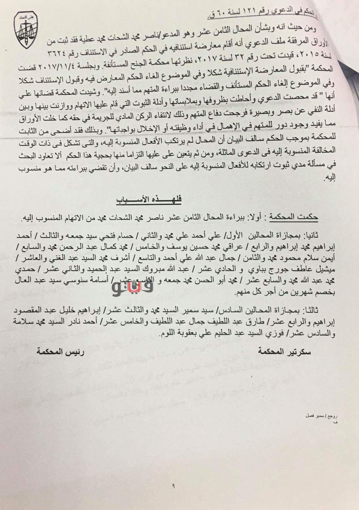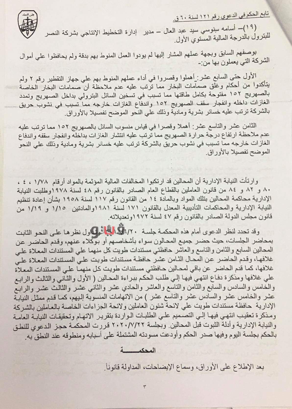 ووجهت المحكمة اللوم للمخالف سيد سمير محمد، نائب رئيس وردية بالشئون الفنية خصم أجر شهرين من راتب كل من: أيمن سلام محمود، ماهر بالشئون الفنية، وجمال عبد الله علي، ماهر بجهاز التقطير، وأشرف محمد السيد، مراقب تكرير بجهاز التقطير، وميشيل عاطف جورج، رئيس قسم بجهاز التقطير بالشئون الفنية، وعبد الله مبروك السيد، فني ومشغل أجهزة تكرير، وحمدي محمد عبد الله، فني تكرير.