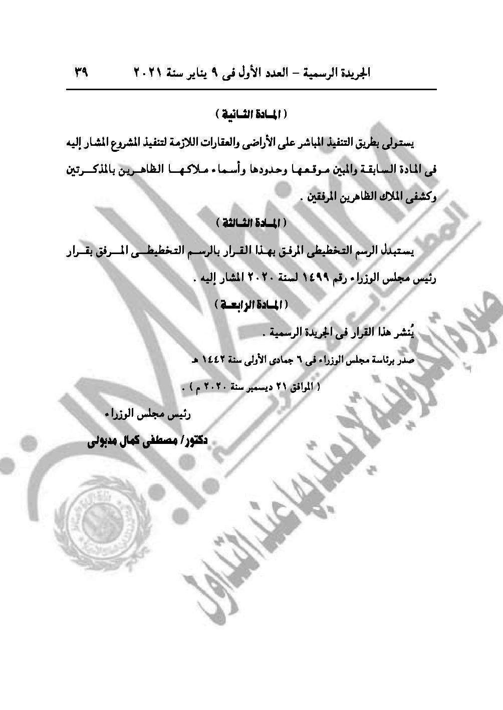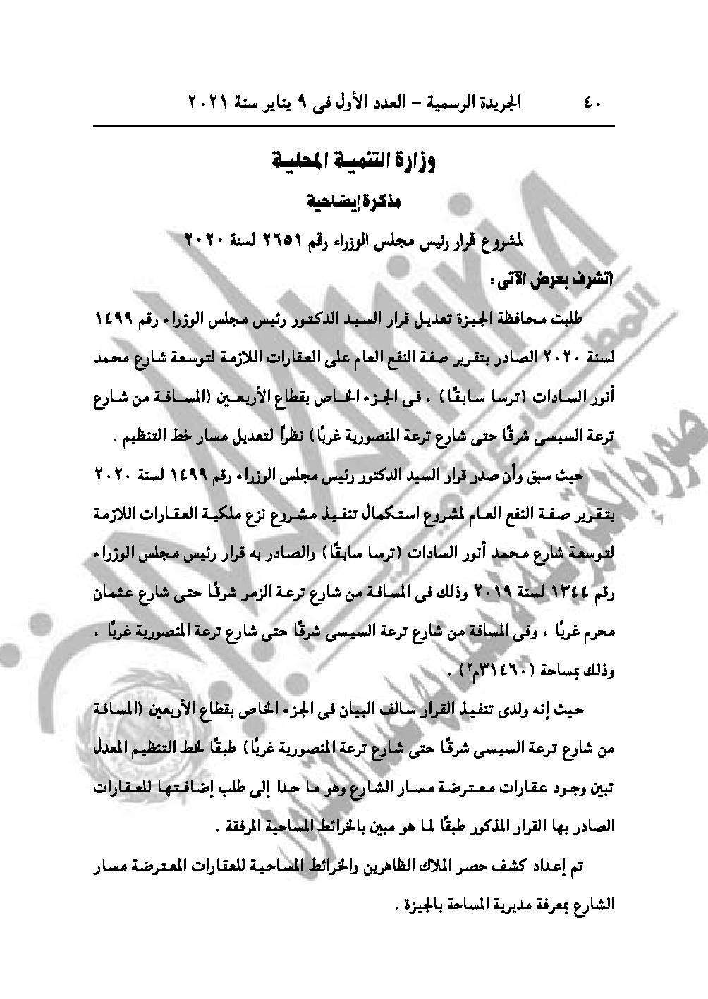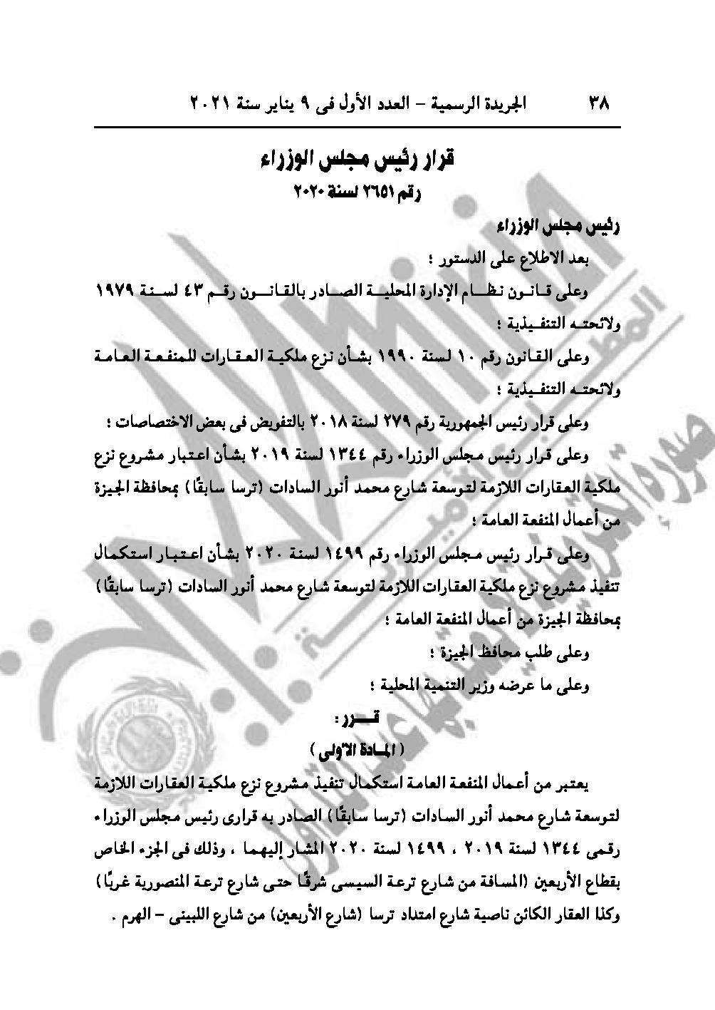 القرار رقم 2651 لسنة 2020، باعتبار استكمال تنفيذ مشروع نزع ملكية العقارات اللازمة لتوسعة شارع محمد أنور السادات (ترسا سابقًا)، الصادر به قرارى رئيس مجلس الوزراء رقمي 1344 لسنة 2019، 1499 لسنة 2020 من أعمال المنفعة العامة.
