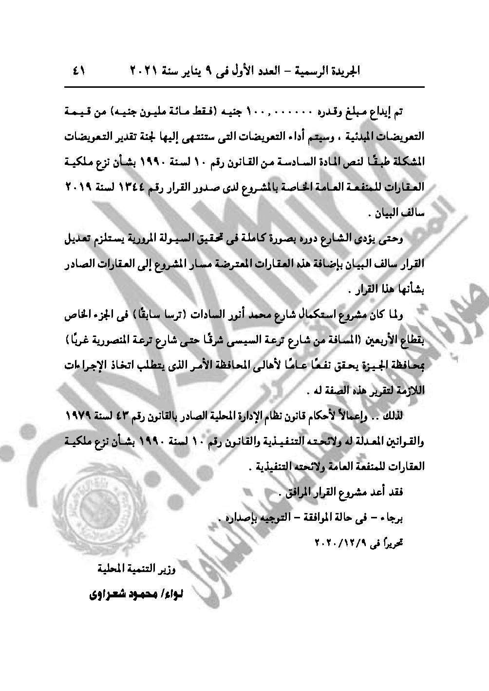 نشرت الجريدة الرسمية في عددها الأول، الصادر في 9 يناير 2021، قرارا رئيس مجلس الوزراء الدكتور مصطفى مدبولي باعتبار استكمال تنفيذ مشروع نزع ملكية العقارات اللازمة لتوسعة شارع محمد أنور السادات (ترسا سابقًا)، و المرحلة الأولى من مشروع إنشاء وصلة حرة لربط كوبري فوة بالبحيرة من أعمال المنفعة العامة.