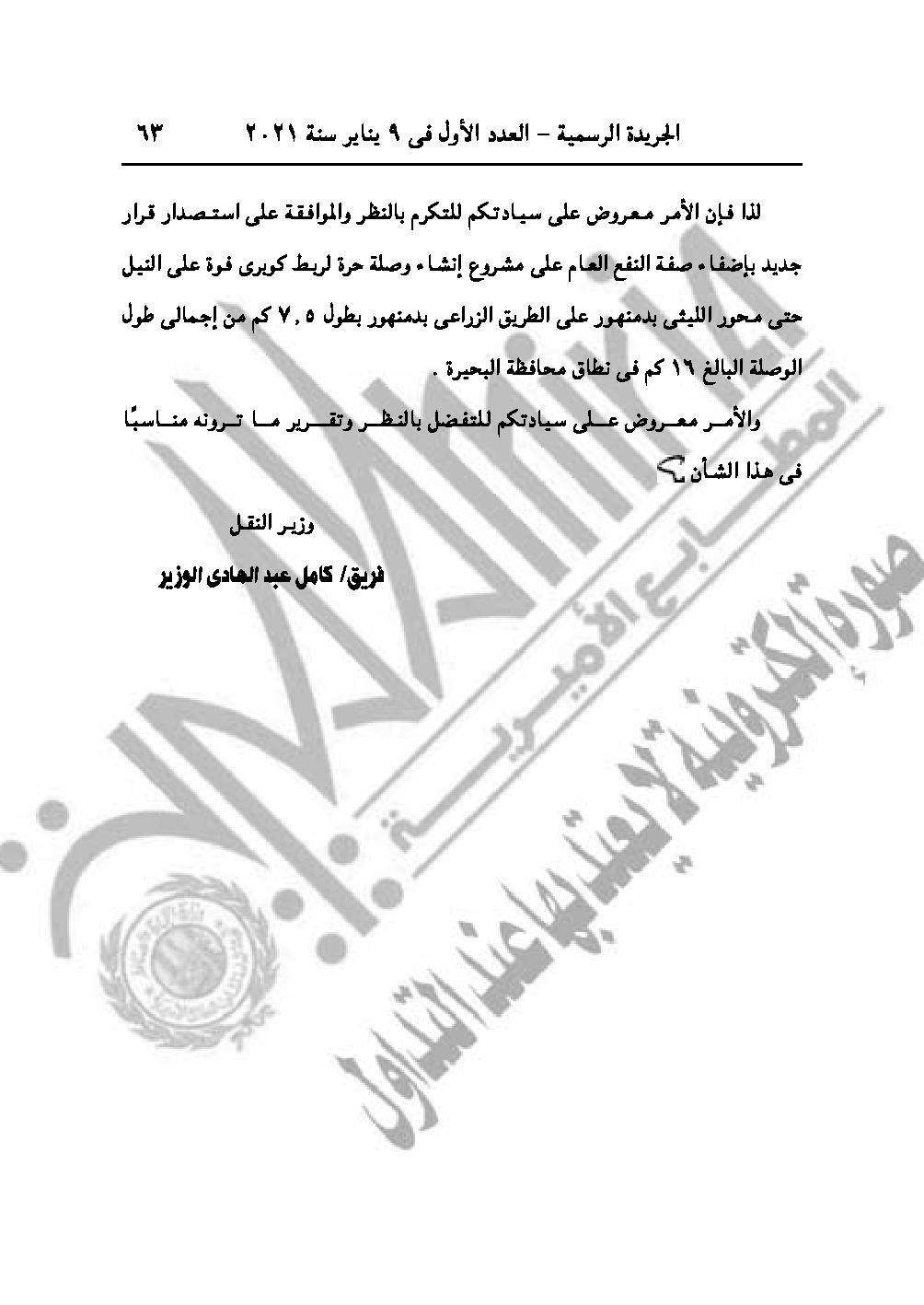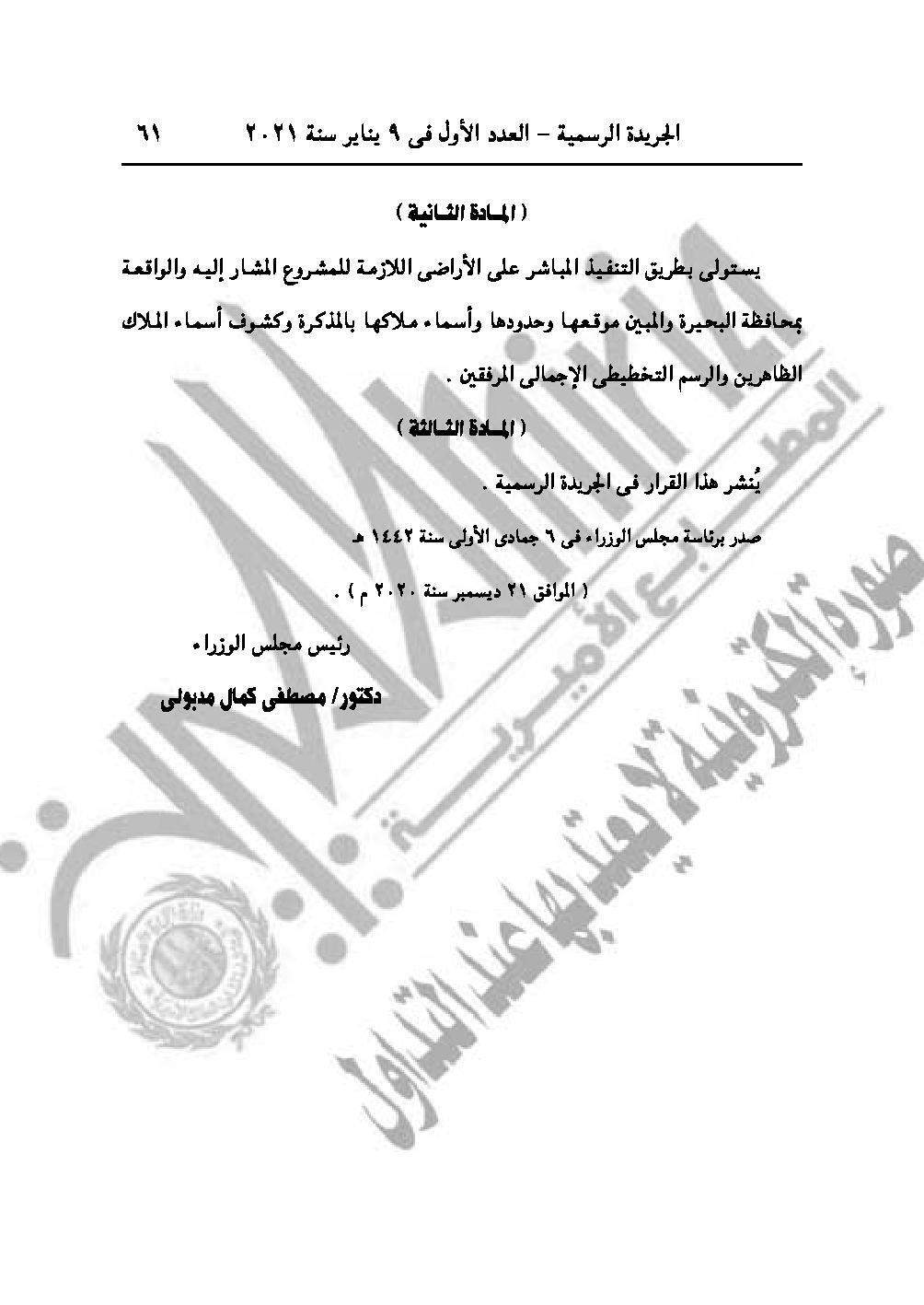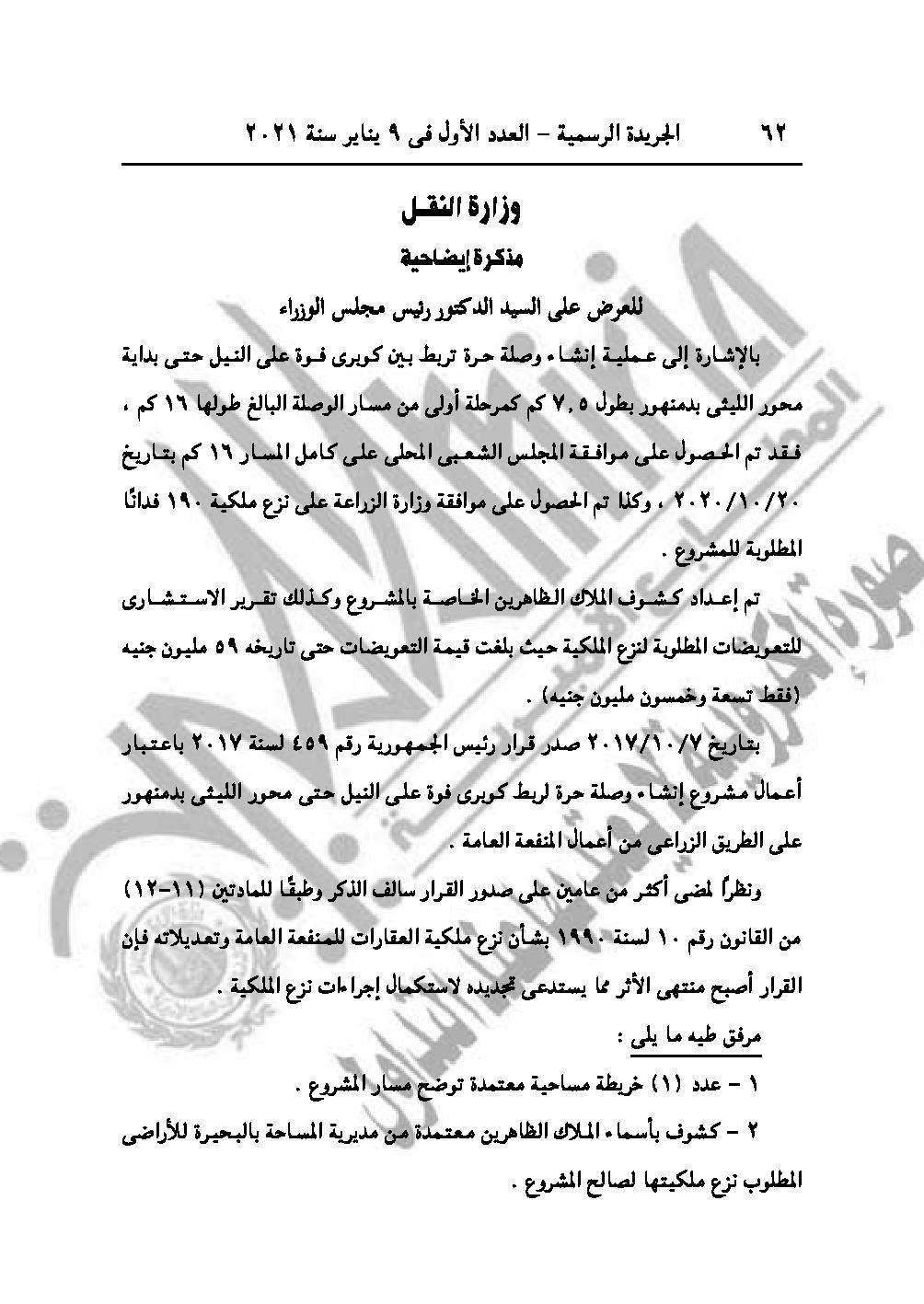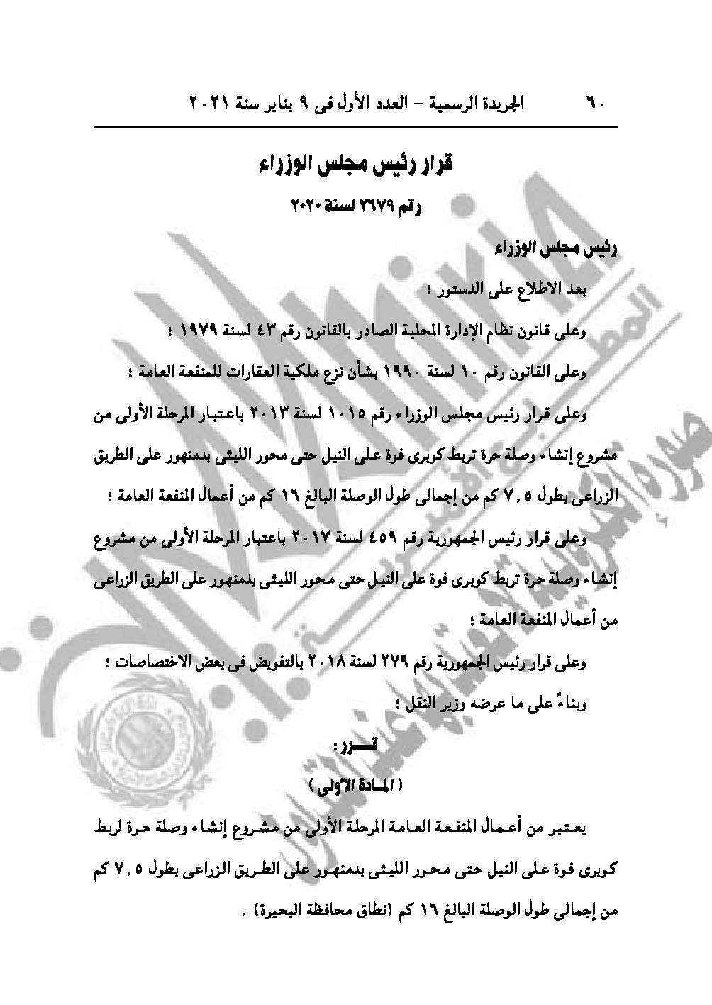 والقرار رقم 2679 لسنة 2020 باعتبار المرحلة الأولى من مشروع إنشاء وصلة حرة لربط كوبري فوة على النيل حتى محور الليثي بدمنهور على الطريق الزراعي (نطاق محافظة البحيرة) من أعمال المنفعة العامة.