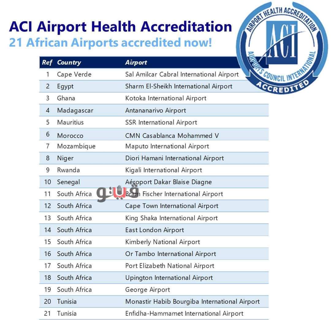 أعلن المجلس الدولي للمطارات لإقليم افريقيا عن قائمة المطارات الـ 21 المعتمدة صحياً في قارة أفريقيا، حيث حل مطار شرم الشيخ الدولي في صدارة تلك المطارات ضمن برنامج الاعتماد الصحي للمطارات AHA الذي أطلقه المجلس من أجل سفر آمن في ظل جائحة كورونا.