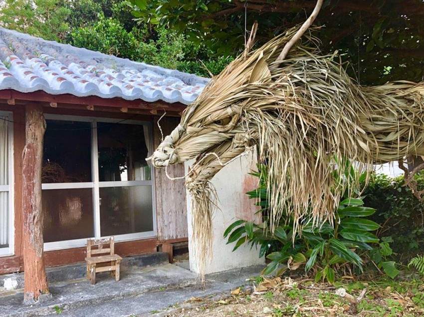 استطاعت الفنانة اليابانية أياكو تدشين تنين ياباني عملاق باستخدام الخشب وأغصان النخيل المجففة بطريقة توحي بأنه كائن طبيعي جاهز للتحليق والطيران والانقضاض في أي وقت.