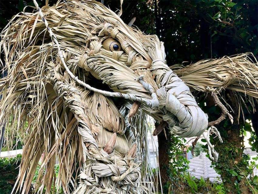 وحقق المهرجان بالفعل في العام الماضي نجاحاً كبيراً، ولكن عملاً واحداً استرعى انتباه الجميع وحاز على إعجابهم وهو تمثال تنين ياباني مصنوع من القش وأغصان النخيل والخشب المنحوت يدوياً.