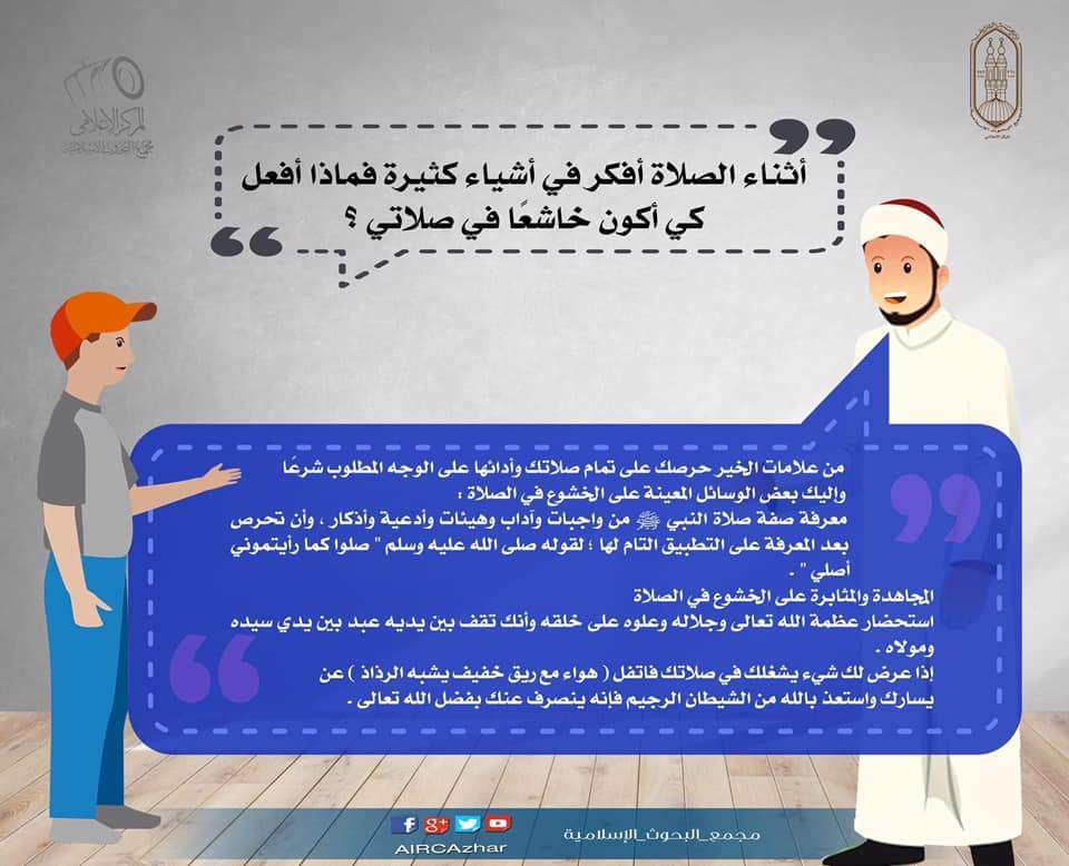 ورد سؤال إلى لجنة الفتوى بمجمع البحوث الإسلامية بالأزهر الشريف، يقول فيه صاحبه " أثناء الصلاة أفكر في أشياء كثيرة فماذا أفعل كي أكون خاشعًا في صلاتي ؟"، وجاء رد اللجنة كالتالي: