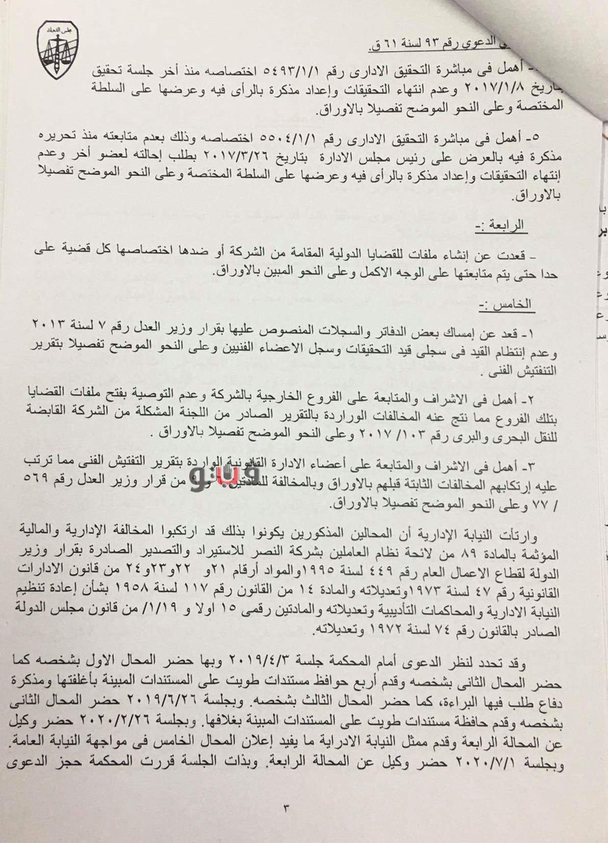 وتبين من أوراق القضية أن المحالين من الأول حتى الرابع أهملوا في مباشرة بعض التحقيقات الإدارية وتراخوا في إعداد المذكرات وعرضها على السلطة المختصة وتقاعسوا عن إتخاذ إجراءات تنفيذ بعض الأحكام الصادرة لصالح الشركة جهة عملهم، ولم تقم المحالة الرابعة منفردة بإنشاء ملف للقضايا الدولية المقامة من الشركة أو ضدها حتى يتم متابعتها على الوجه الأكمل.
