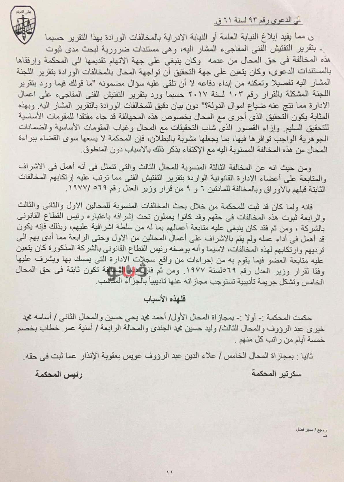 وأرفق مع مذكرة المستشار القانوني لوزارة قطاع الأعمال العام ملف الشكوى ومذكرة إدارة التفتيش الفني على الإدارات القانونية بوزارة العدل مؤشر عليه من الوزير بالموافقة على طلب مساعد وزير العدل بإحالة المخالفين للمحكمة التأديبية العليا التي قضت بخصم أجر خمسة أيام من راتب المحالين من الأول حتى الرابعة، ووجهت عقوبة الإنذار للمحال الأخير.