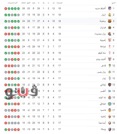 ويحتل حاليا فريق أتلتيكو مدريد صدارة جدول الترتيب بـ38 نقطة، ويأتي ريال مدريد في المركز الثاني بـ37 نقطة،