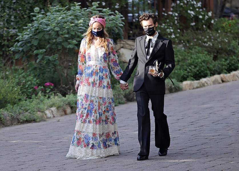 وظهرت اوليفيا في الصور مرتدية فستان طويل مزين بالورود ونسقته مع ربطة وردية اللون على شعرها واختار هاري بدلة سوداء أنيقة ووضع الثنائي الكمامة الوقائية.