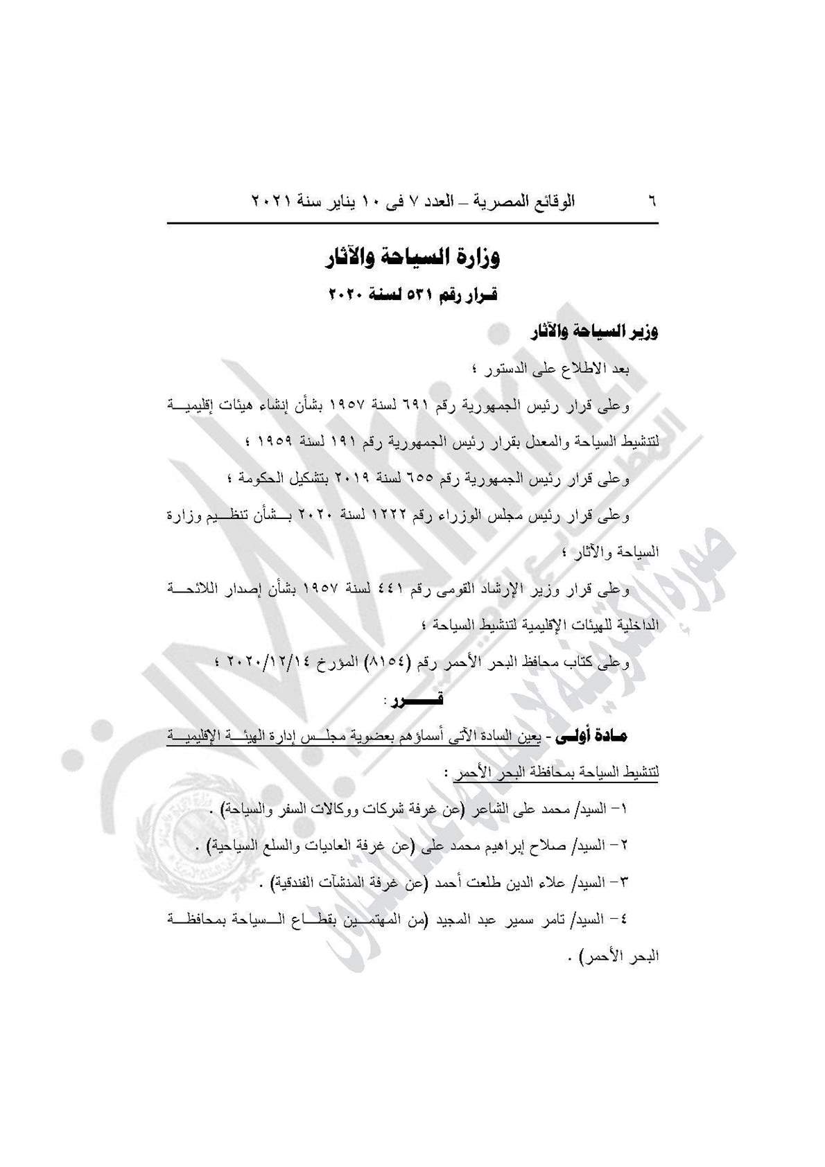 القرار رقم 531 لسنة 2020، بتعيين 6 أعضاء منهم محمد على الشاعر، عن غرفة شركات ووكالات السفر والسياحة، وصلاح إبراهيم محمد علي، عن غرفة العاديات والسلع السياحية، وعلاء الدين طلعت أحمد، عن غرفة المنشآت الفندقية، وغيرهم بعضوية مجلس إدارة الهيئة الإقليمية لتنشيط السياحة.