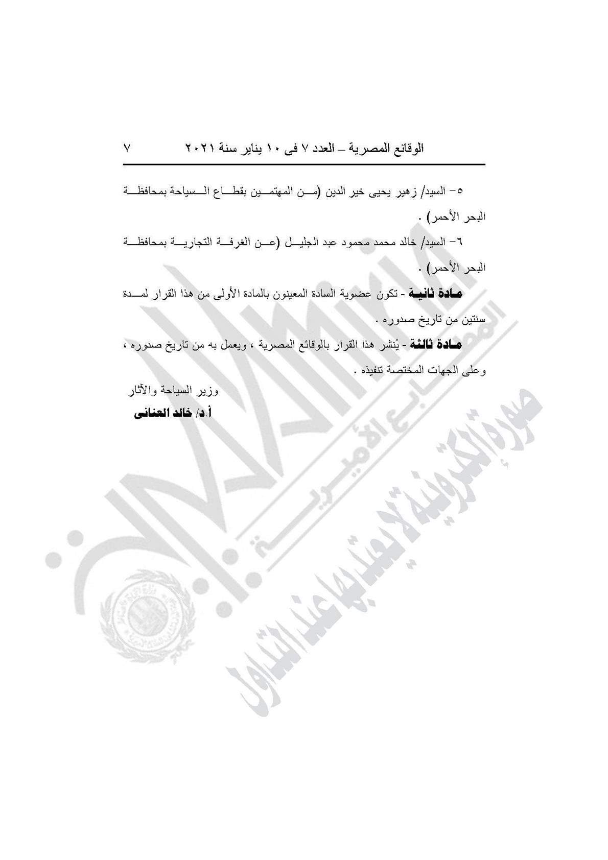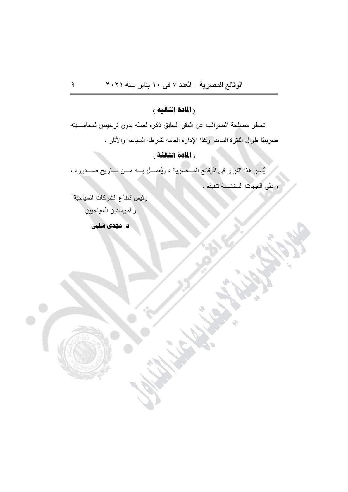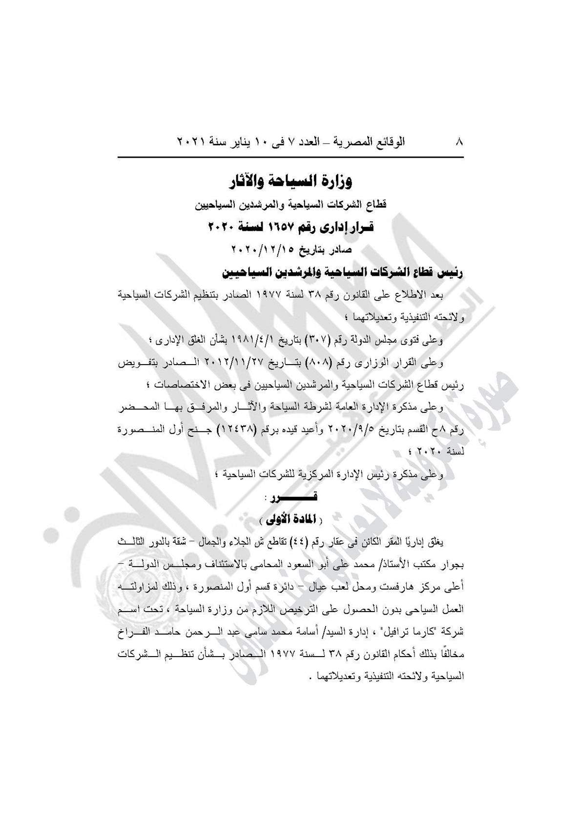 نشرت جريدة الوقائع المصرية في عددها رقم 7، الصادر في 10 يناير 2021، قراري وزارة السياحة والآثار بشأن تعيين 6 أعضاء في مجلس إدارة الهيئة الإقليمية لتنشيط السياحة، وبالغلق الإداري لشركة "كارما ترافيل"، بدائرة قسم أول المنصورة.