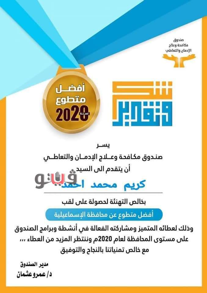 أختير الطالب كريم عرفه رئيس اتحاد طلاب كلية الآداب والعلوم الإنسانية، نائبًا لمحافظة الإسماعيلية ببرلمان شباب مصر كما تم اختياره كأفضل متطوع بمحافظة الإسماعيلية لعام ٢٠٢٠ من قبل صندوق مكافحة وعلاج الإدمان والتعاطي التابع لوزارة التضامن الاجتماعى برعاية رئاسة الوزراء.