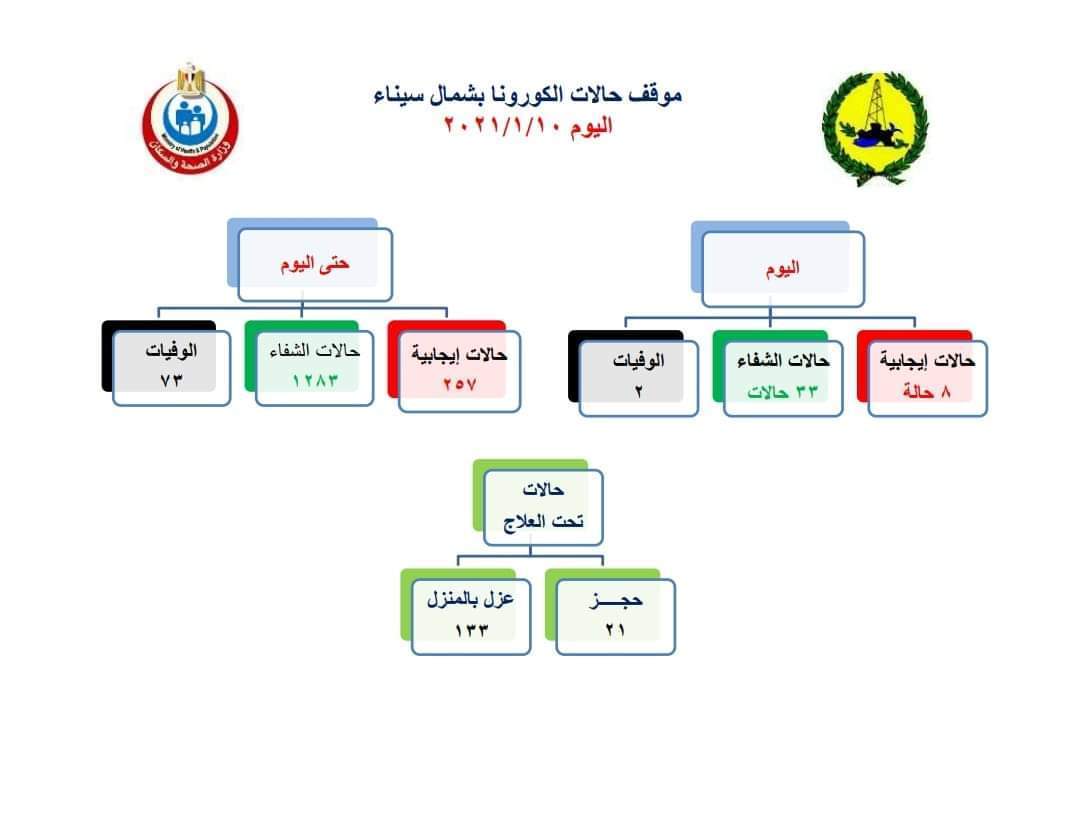 أعلنت مديرية الصحة بشمال سيناء وفاة حالتين من الحالات المصابة بفيروس كورونا ليصبح إجمالي الوفيات منذ تفشي الوباء ٧٣ حالة.