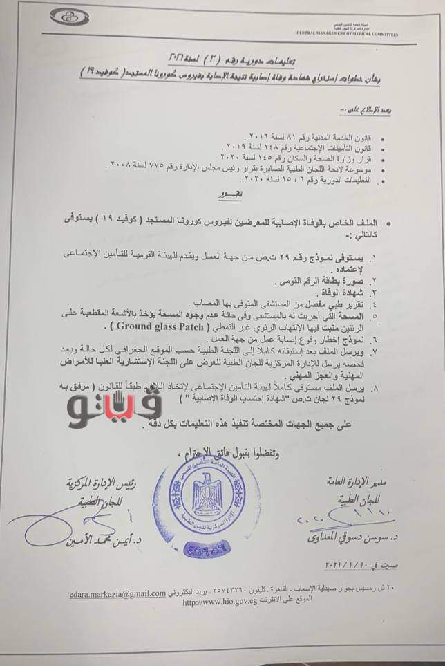أصدرت الإدارة المركزية للجان الطبية بالهيئة العامة للتأمين الصحي تعليمات دورية رقم 3 لسنة ٢٠٢١ بشأن خطوات استخراج شهاده وفاة مثبت فيها الوفاة نتيجة الإصابة بفيروس كورونا المستجد.