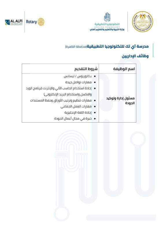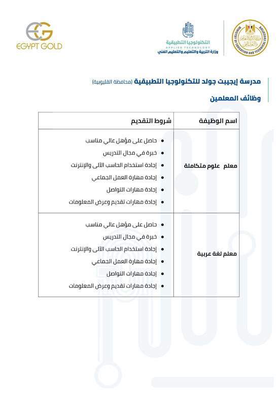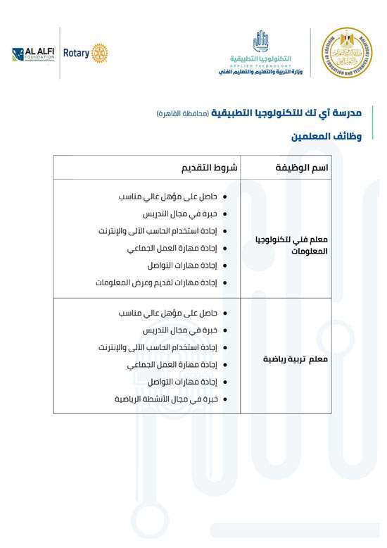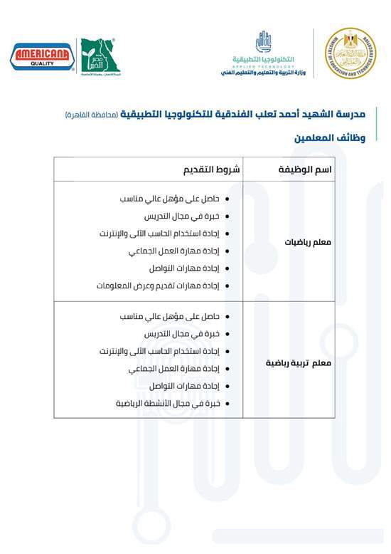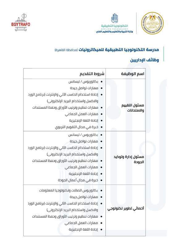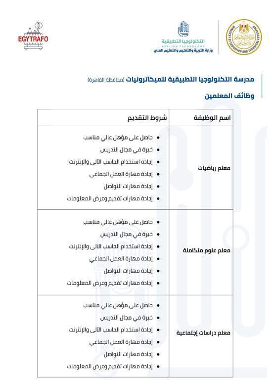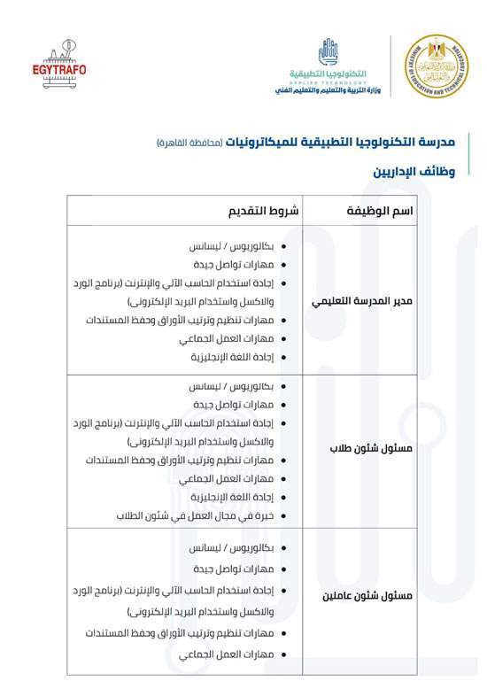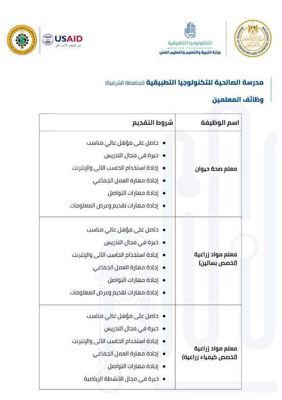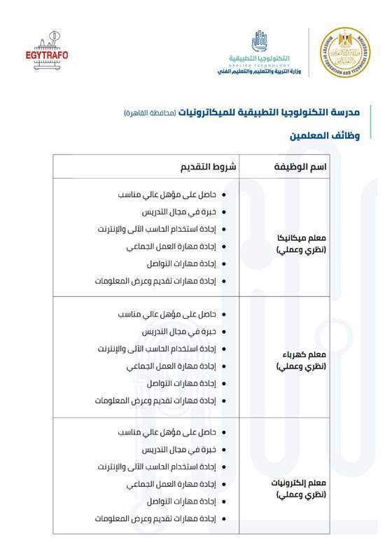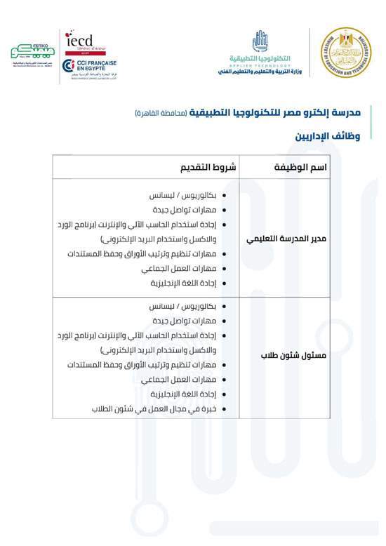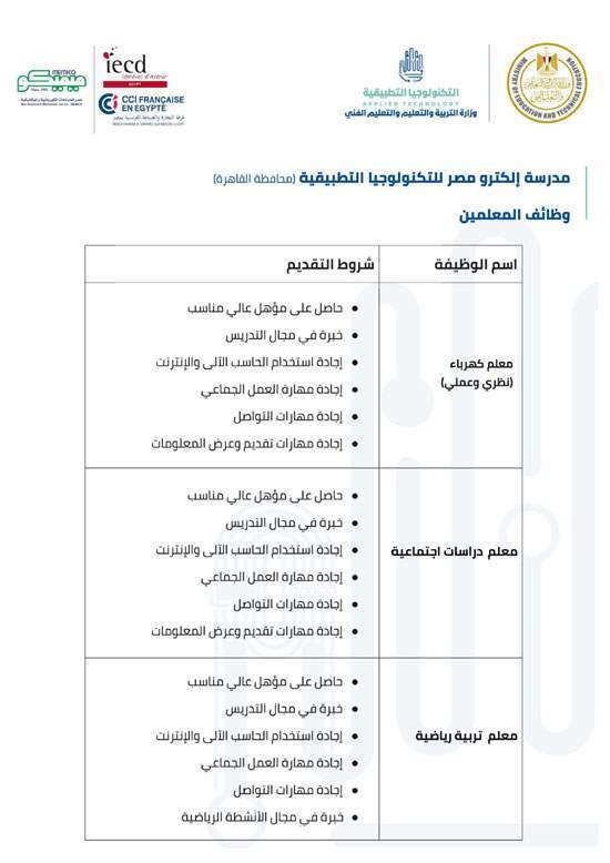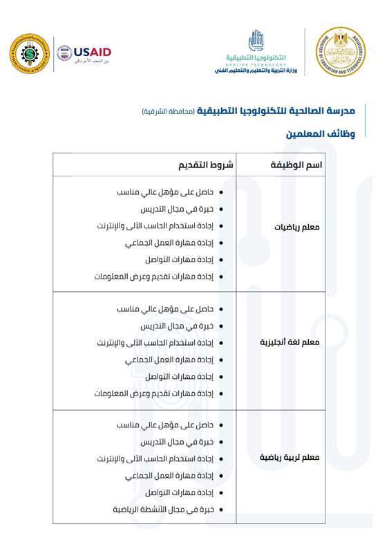 وفيما يلي شروط كل وظيفة للالتحاق بفريق عمل مدارس التكنولوجيا التطبيقية.