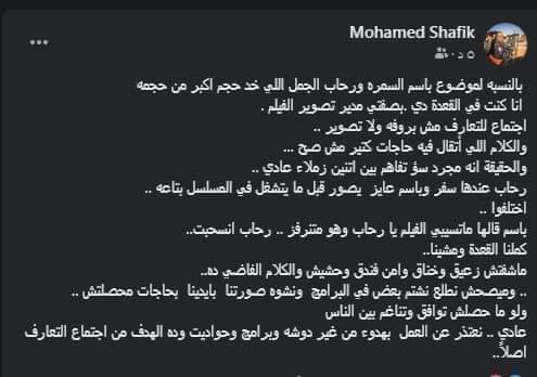 وفي هذا السياق كتب شفيق منشور مطول عبر صفحته بموقع التواصل الاجتماعي "فيس بوك" ليكشف تفاصيل الواقعة حيث قال: "بالنسبة لموضوع باسم السمره ورحاب الجمل اللي خد حجم أكبر من حجمه، أنا كنت في القعدة دي بصفتي مدير تصوير الفيلم، اجتماع للتعارف مش بروفه ولا تصوير، والكلام اللي أتقال فيه حاجات كتير مش صح، والحقيقة أنه مجرد سوء تفاهم بين اتنين زملاء عادي.. رحاب عندها سفر وباسم عايز يصور قبل ما يتشغل في المسلسل بتاعه، اختلفوا، باسم قالها ماتسيبي الفيلم يا رحاب وهو متنرفز، رحاب انسحبت، كملنا القعدة ومشينا، ماشفتش زعيق وخناق وأمن فندق وحشيش والكلام الفاضي ده".