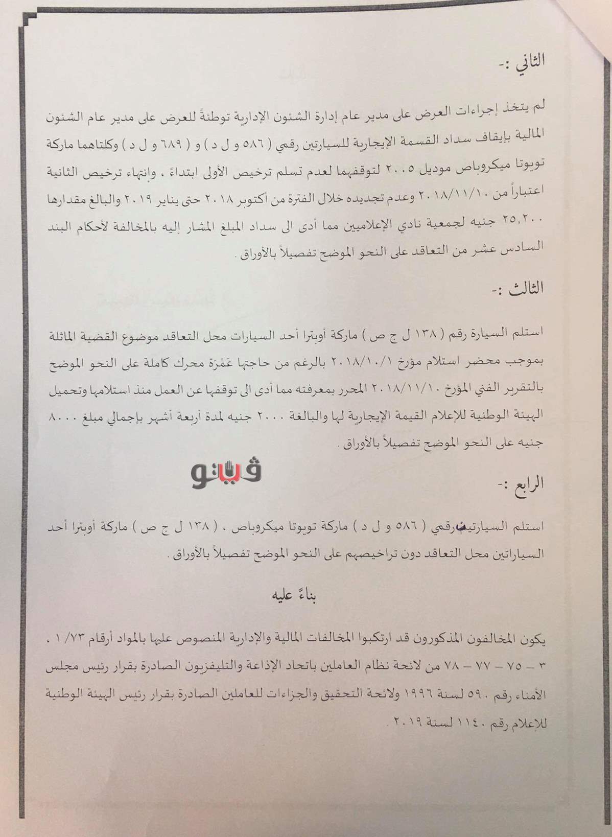 كما تبين أن محمد محمدي محمد – مدير إدارة الخدمات الداخلية بقطاع الأخبار لم يتخذ إجراءات العرض على مدير عام إدارة الشئون الإدارية ومدير عام الشئون المالية بإيقاف سداد القيمة الإيجارية للسيارتين رقمي ٥٨٦ و ل د ــ ٦٨٩ و ل د، وكلتاهما ماركة تويوتا ميكروباص موديل ٢٠٠٥ – لتوقفهما لعدم تسليم ترخيص الأولى ابتداء وانتهاء ترخيص الثانية لجمعية نادي الإعلاميين مما أدى إلى سداد المبلغ بالمخالفة لأحكام البند السادس عشر من التعاقد.