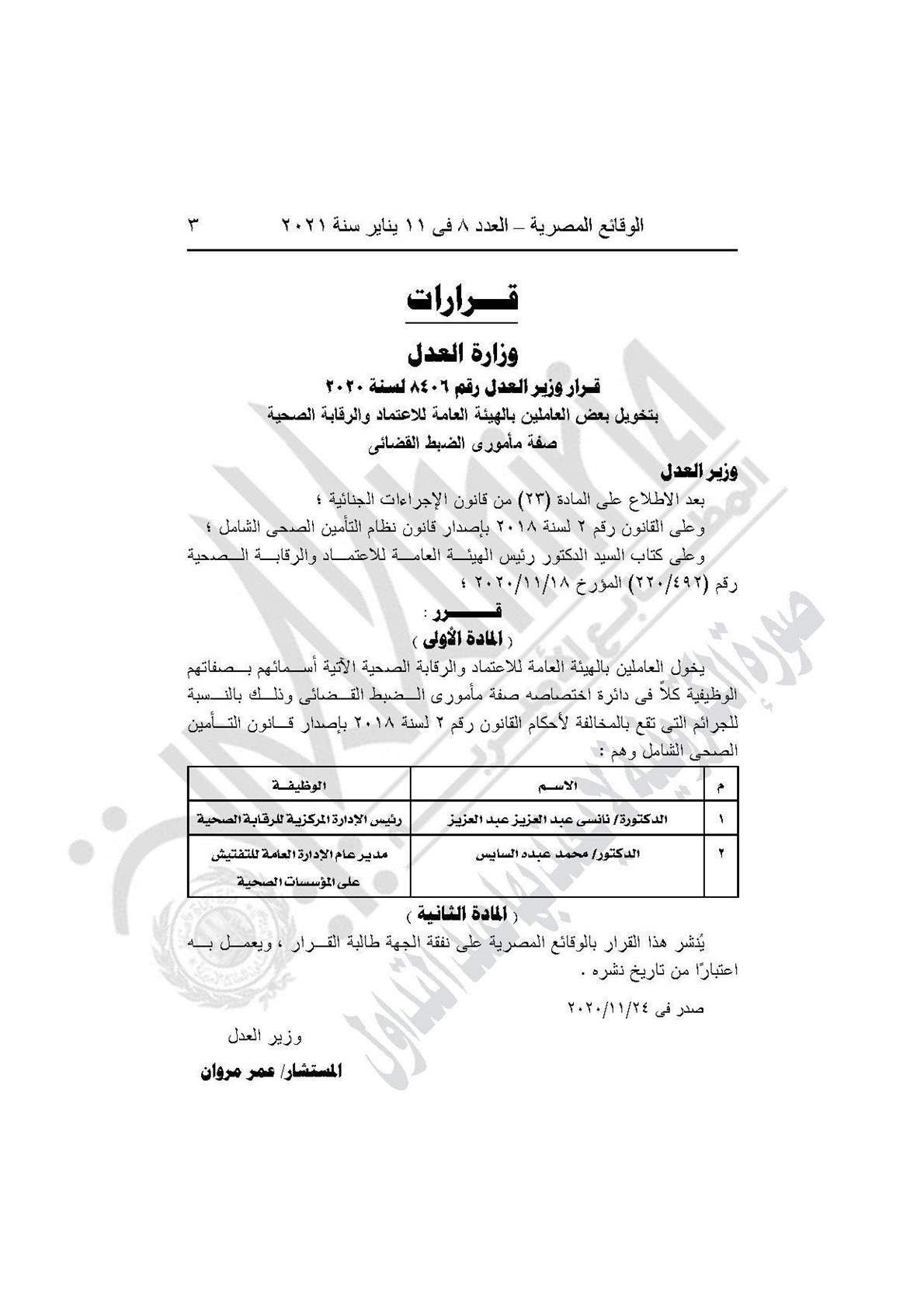 نشرت جريدة الوقائع المصرية في عددها رقم 8، الصادر في 11 يناير 2021، قرار وزير العدل المستشار عمر مروان رقم 8406 لسنة 2020، بشأن تخويل بعض العاملين بالهيئة العامة للاعتماد والرقابة الصحية صفة مأمورى الضبط القضائي.