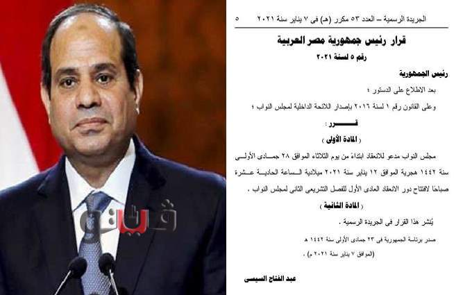 وكان الرئيس عبد الفتاح السيسي، دعا مجلس النواب للانعقاد في الفصل التشريعي الثاني اعتبارا من غد الثلاثاء الموافق ١٢ يناير ٢٠٢١م، وذلك جاء ذلك وفقا لما نشرته الجريدة الرسمية، حيث تلا هذا القرار أيضا أسماء النواب المعينين.