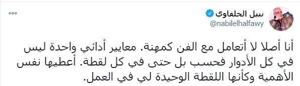 وكتب الخلفاوي عبر صفحته الرسمية على موقع التدوينات القصيرة "تويتر": "أنا أصلا لا أتعامل مع الفن كمهنة.. معايير أدائي واحدة ليس في كل الأدوار فحسب بل حتى في كل لقطة..أعطيها نفس الأهمية وكأنها اللقطة الوحيدة لي في العمل".