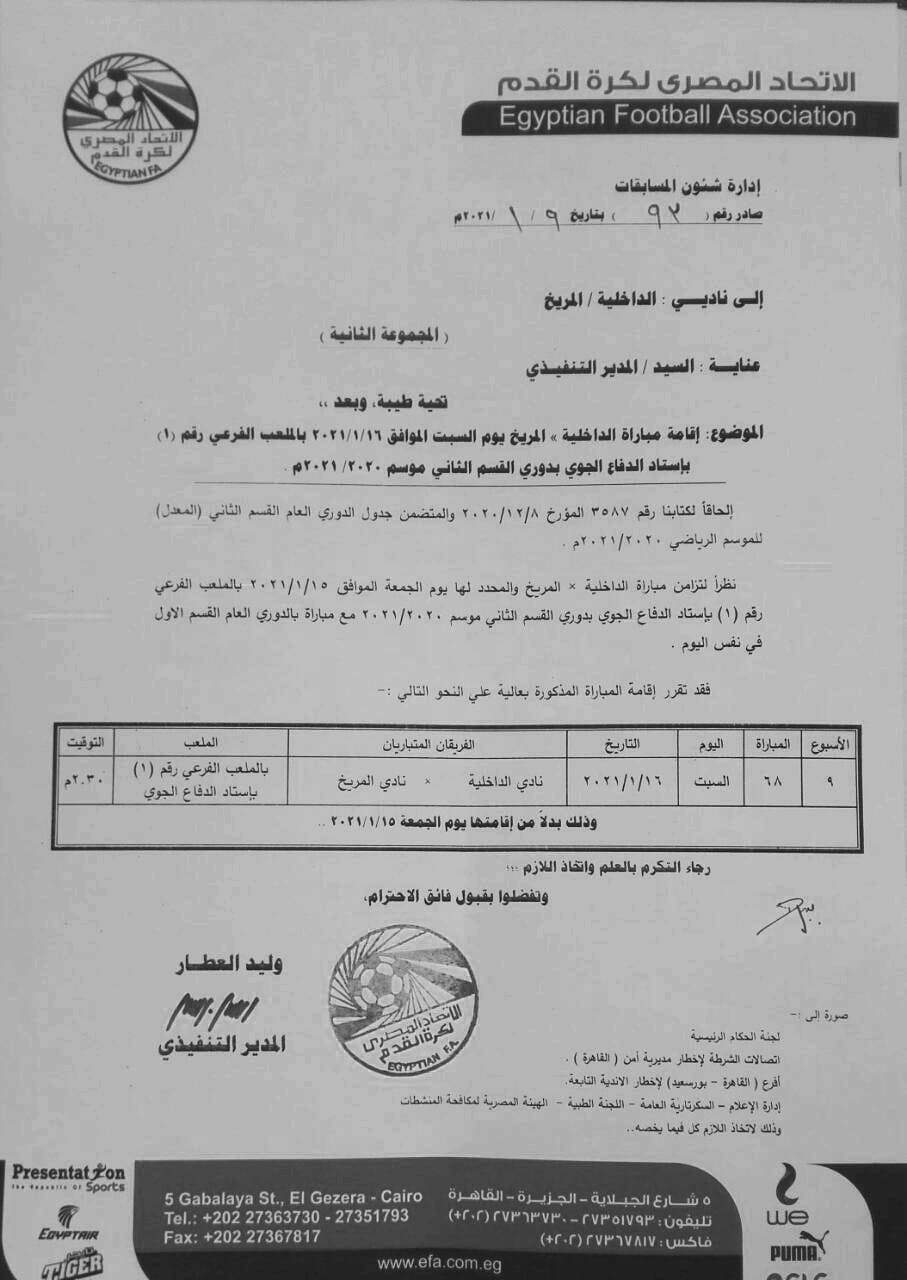 وجاء تأجيل اللقاء الذي يستضيفه الملعب الفرعي لاستاد الدفاع الجوي، لتزامنه مع لقاء بيراميدز ضد المقاولون العرب في الدوري الممتاز والمقرر لها بملعب الدفاع الجوي "30 يونيو".